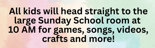 Children's Church takes place every Sunday morning at 10 AM! Just head into the Sunday School hallway or ask for directions!