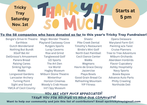 Elkton Presbyterian Church will be hosting our 20th annual Tricky Tray fundraiser and benefits our Outreach program and our Food Pantry on Saturday, November 1st at 5PM.